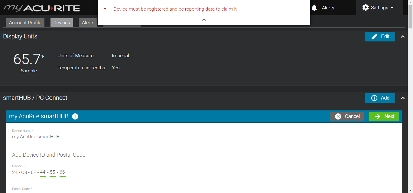 When adding my smartHUB, I receive an error message - Device must be registered and be reporting data to claim it